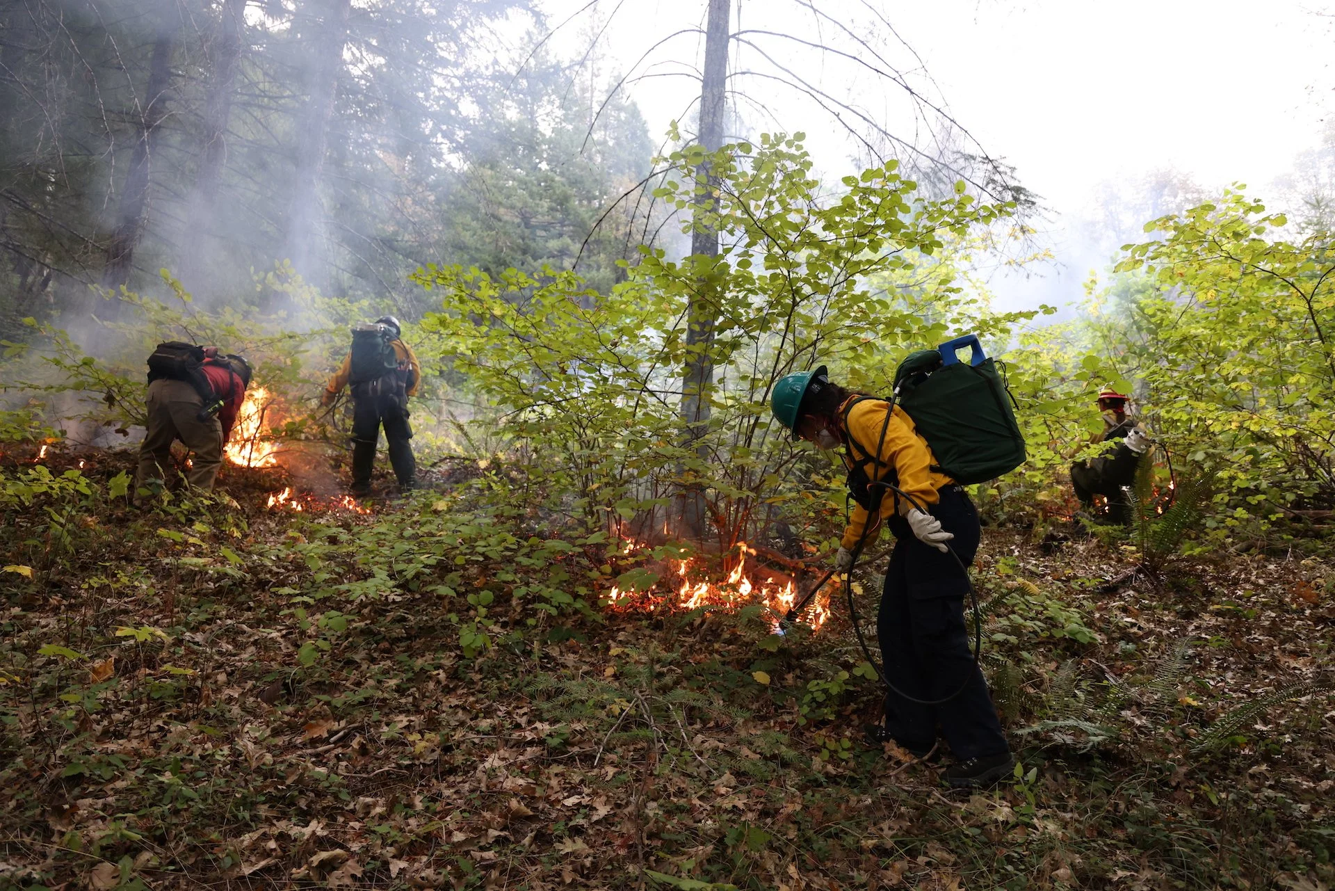 2025 Klamath River TREX participants using propane torches to burn Hazel.